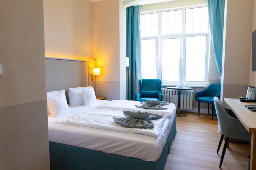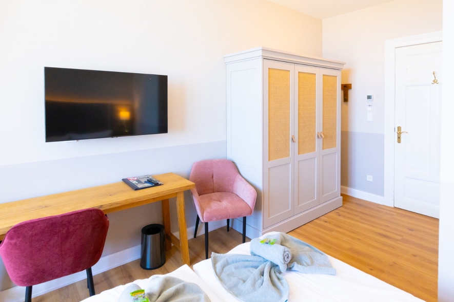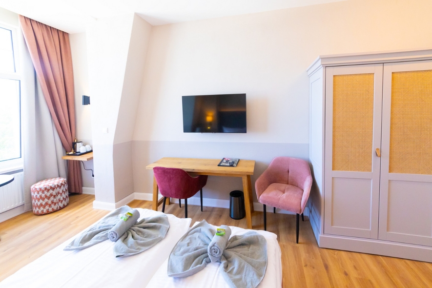 Diese Doppelzimmer bieten einen ungestörten Blick auf die Ostsee, den man auch am Abend an dem runden Tisch sitzend mit einem Glas Wein genießen kann. Die meisten Zimmer sind ausgestattet mit Schreibtisch und Flachbild-TV.