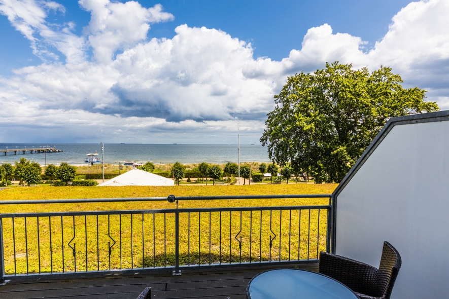 Diese Doppelzimmer bieten einen ungestörten Blick auf die Ostsee, den man auch am Abend an dem runden Tisch sitzend mit einem Glas Wein genießen kann. Diese Zimmer verfügen des Weiteren über einen Balkon, der mit Tisch und Stühle ausgestattet ist. Die meisten Zimmer sind ausgestattet mit Schreibtisch und Flachbild-TV.
