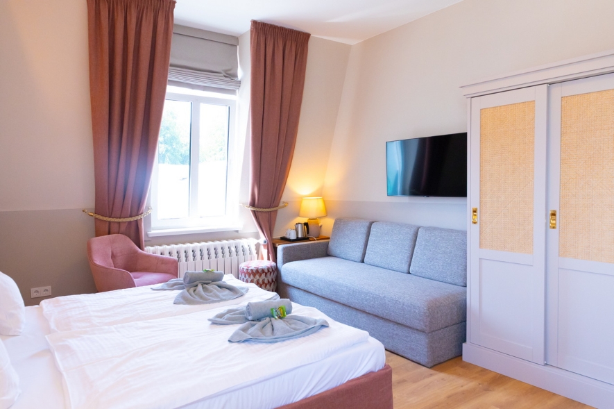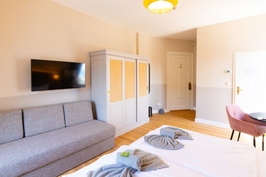 Diese Doppelzimmer auf der Stirnseite unseres Hauses bieten einen seitlichen Seeblick auf die Ostsee. Diese Zimmer verfügen noch zusätzlich über eine Schlafcoach. Die Zimmer sind ausgestattet mit Schreibtisch und Flachbild-TV.