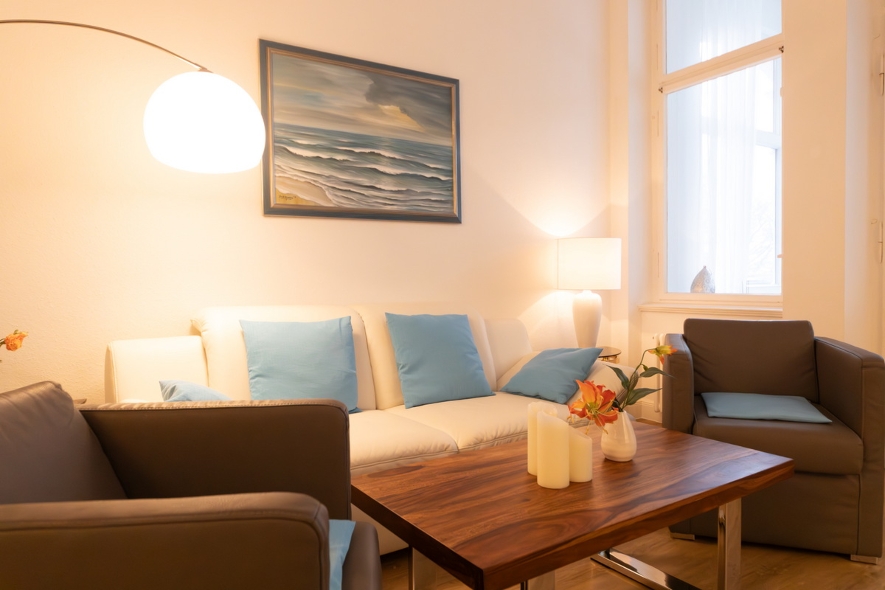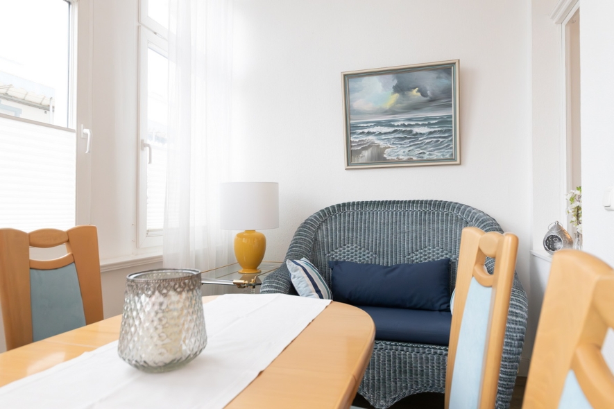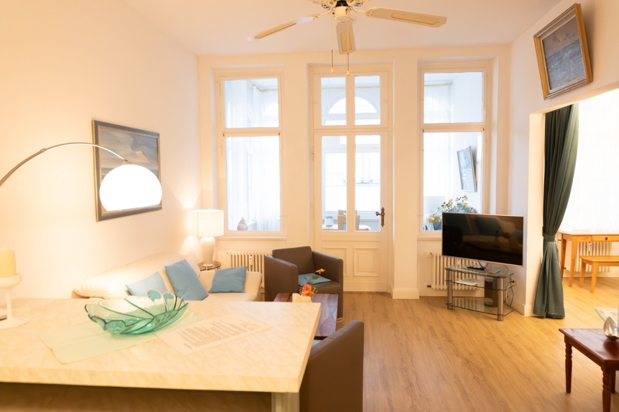 Diese Ferienwohnung ist ca. 72 qm groß und für 2 – 4 Personen geeignet. Sie befindet sich in der Bäderstil-Villa „Seeblick“ unmittelbar an der Strandpromenade in Bansin (Nebengebäude des Hotels „Germania“). Vom Verandazimmer genießen Sie einen schönen Blick auf die Ostsee. Die Ferienwohnung ist ausgestattet mit Geschirrspüler, Fön, Flachbild-Sat-TV, Kühl-Gefrierschrank, Mikrowelle, Wasserkocher, Whirlpoolbadewanne und zusätzlich zum Badezimmer eine getrennte Dusche/WC. Einkaufsgelegenheiten, Bansins vielfältige Gastronomie und die Seebrücke erreichen Sie bequem zu Fuß. Auch Usedoms gut ausgebaute Rad- und Wanderwege beginnen unmittelbar vor Ihrer Tür. Die Kosten für die Endreinigung sind im Zimmerpreis bereits enthalten.