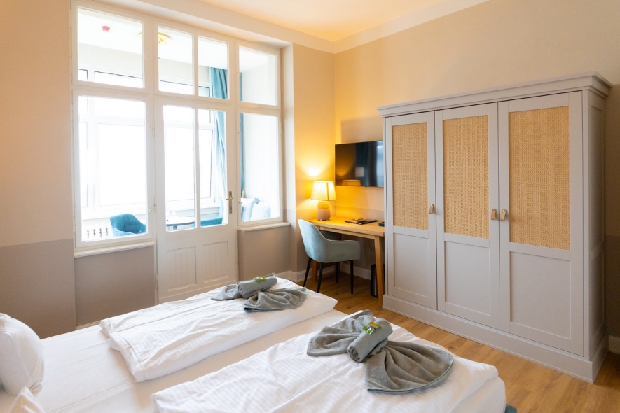 Diese Junior Suiten verfügen über eine separate Veranda, die mit einer Schlafcoach sowie Schreibtisch und Flachbild-TV und teilweise mit einem bequemen Sessel ausgestattet sind. Von den Junior Suiten haben Sie einen ungestörten Blick auf die Ostsee. Die Junior Suiten sind ausgestattet mit Wasserkocher sowie Teebeutel und Kaffee-Sticks.